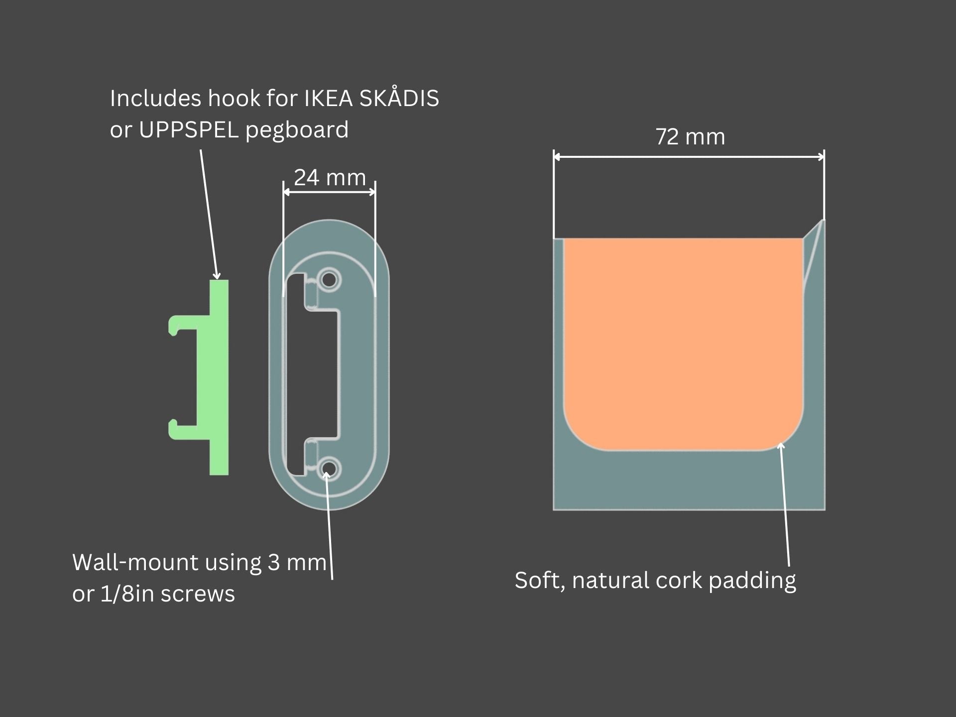 - Two installation options: wall mount (using two 3 mm or 1/8" screws) or IKEA SKÅDIS Pegboard (hook included).