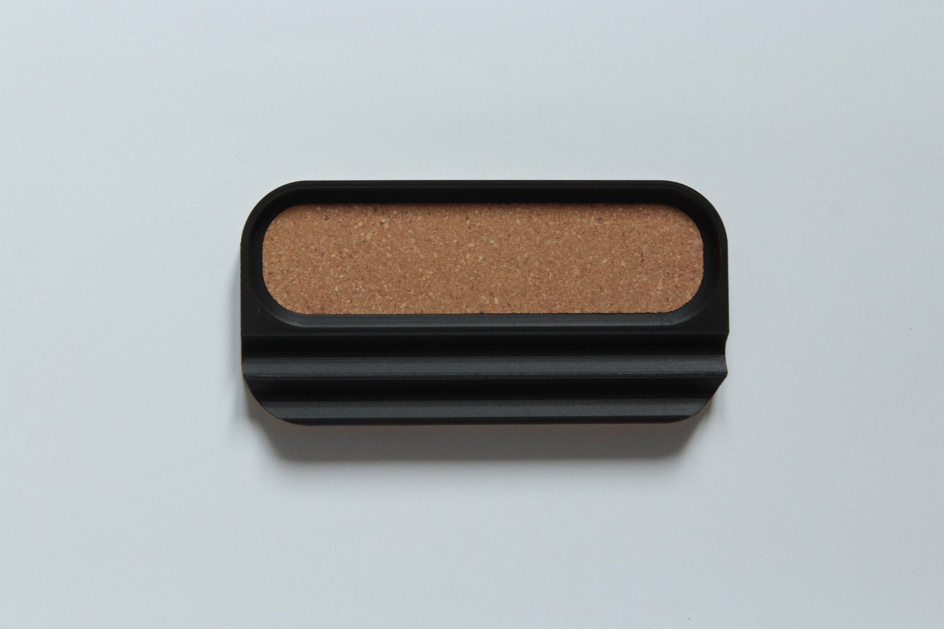 This medium-sized tray combines the best of a normal catch-all tray and a pen tray. It has grooves to keep your pens, markers, pencils and writing or drawing tools, and a pocket lined with soft cork where you can place other items.